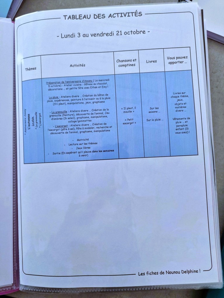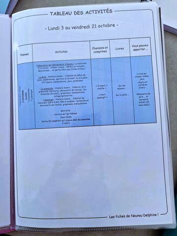 Chaque début de semaine, je prépare un planning hebdomadaire avec les grandes lignes des activités prévues. Celui-ci est glissé dans le cahier d’activités de l’enfant, afin que les parents puissent suivre le fil des propositions et échanger à la maison autour de ce qui a été vécu.