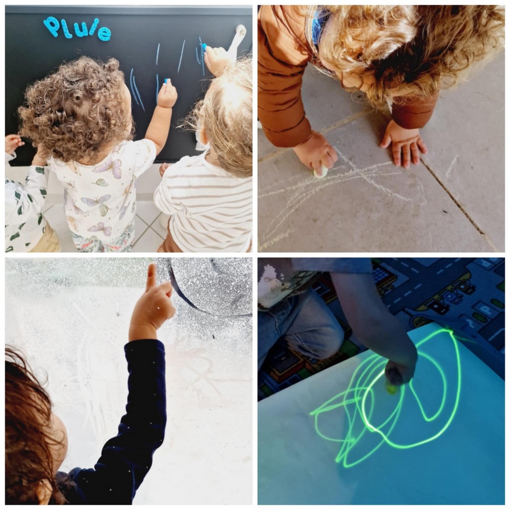 Avec des craies, des crayons, des feutres effaçables, des pinceaux, ou même les doigts, les enfants tracent des lignes, des ponts, des ronds, des spirales…
