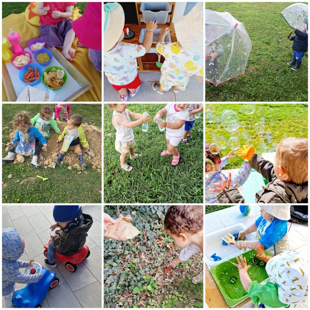 Je propose aux enfants une grande variété de jeux extérieurs, adaptés à leur âge et à leurs envies : petites voitures, cerceaux, plots, ballons, bacs sensoriels, cannes à pêche, animaux flottants, chaises, table pour dessiner, manipuler ou pique-niquer… et même de quoi faire des bulles !