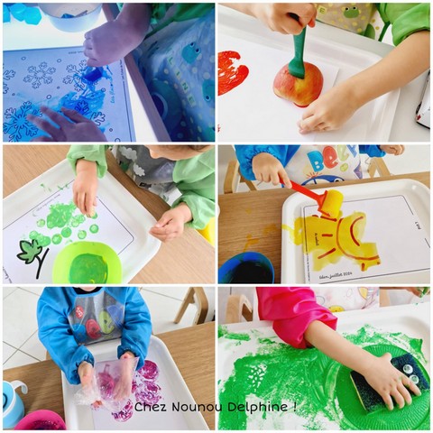 Ici, la peinture a toute sa place : avec les pinceaux, les doigts, des éponges, des cotons-tiges, des bouchons, une paille, ou même des légumes coupés !
