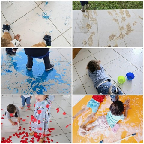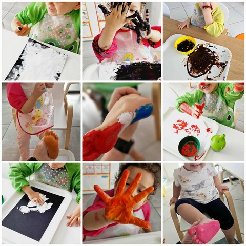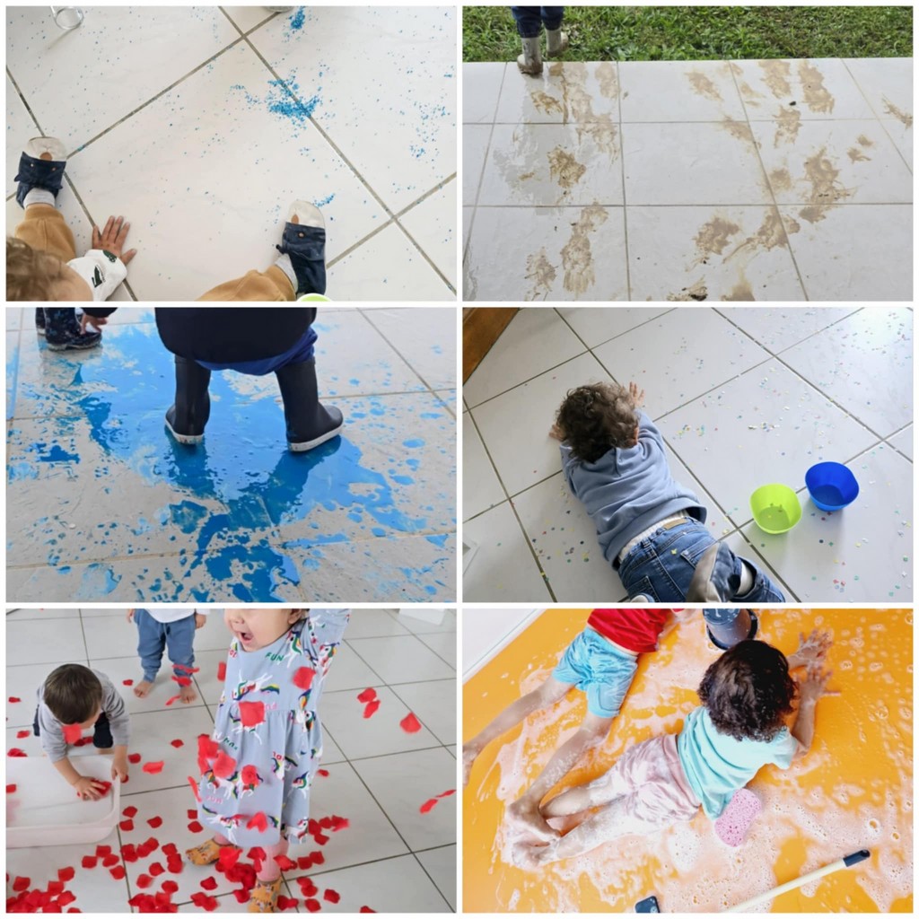 Parfois, on plonge les mains, on tapote avec les doigts, on glisse avec les pieds… et même les orteils y participent ! On touche, on sent, on écrase, on étale, on laisse des traces, on explore… et surtout, on rit beaucoup !