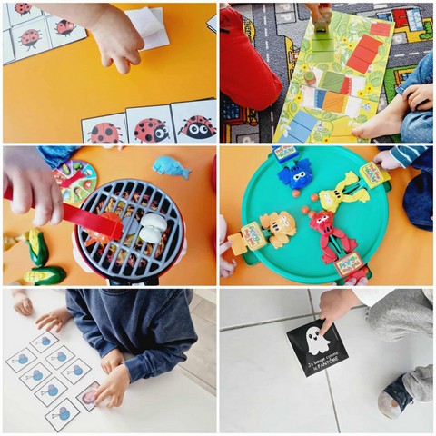 Je propose aussi des jeux de société adaptés aux tout-petits, pour découvrir les premières règles du jeu tout en s’amusant : mémory, dominos, lotos, jeux de tri, d’association ou de manipulation…