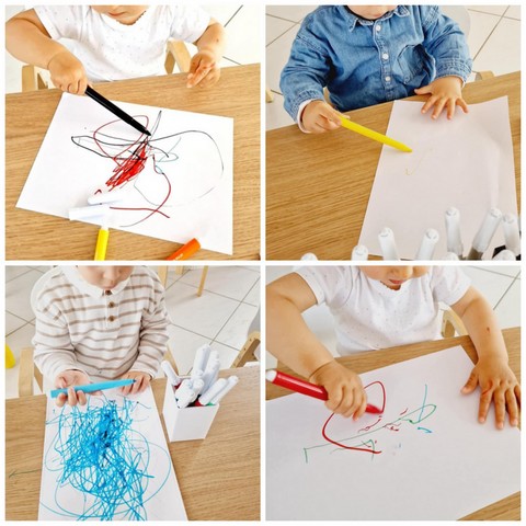 L’enfant choisit lui-même ses outils (crayons, feutres, pastels…) et son support, puis laisse aller son imagination. Il n’y a pas de modèle, pas de consigne, pas de limite : juste lui, son envie du moment, et sa créativité.