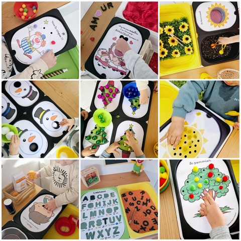 Je propose ces activités sous forme de petits plateaux, de bacs ou de boîtes avec différents éléments à trier, souvent en lien avec un thème ou une saison.